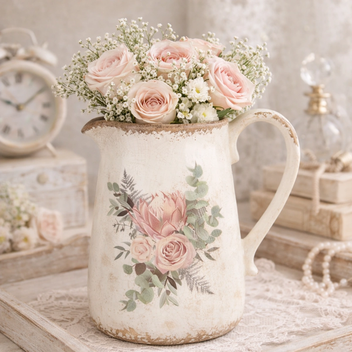 Elegante brocca decorativa in ceramica dal fascino romantico e senza tempo, perfetta per arricchire ambienti in stile shabby chic, provenzale o country.