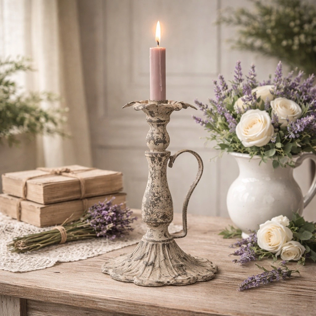 Elegante candelabro dal fascino senza tempo, caratterizzato da una raffinata finitura effetto anticato che richiama l’autenticità degli oggetti d’epoca. Le sue linee sinuose e la base lavorata donano un tocco romantico e delicato, perfetto per ambienti in stile shabby chic e provenzale.