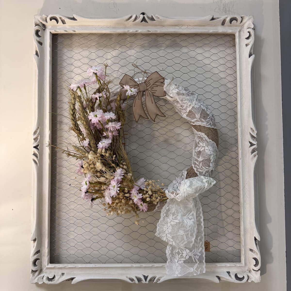 Cornice in legno decorata in stile shabby chic con ghirlanda primaverile.