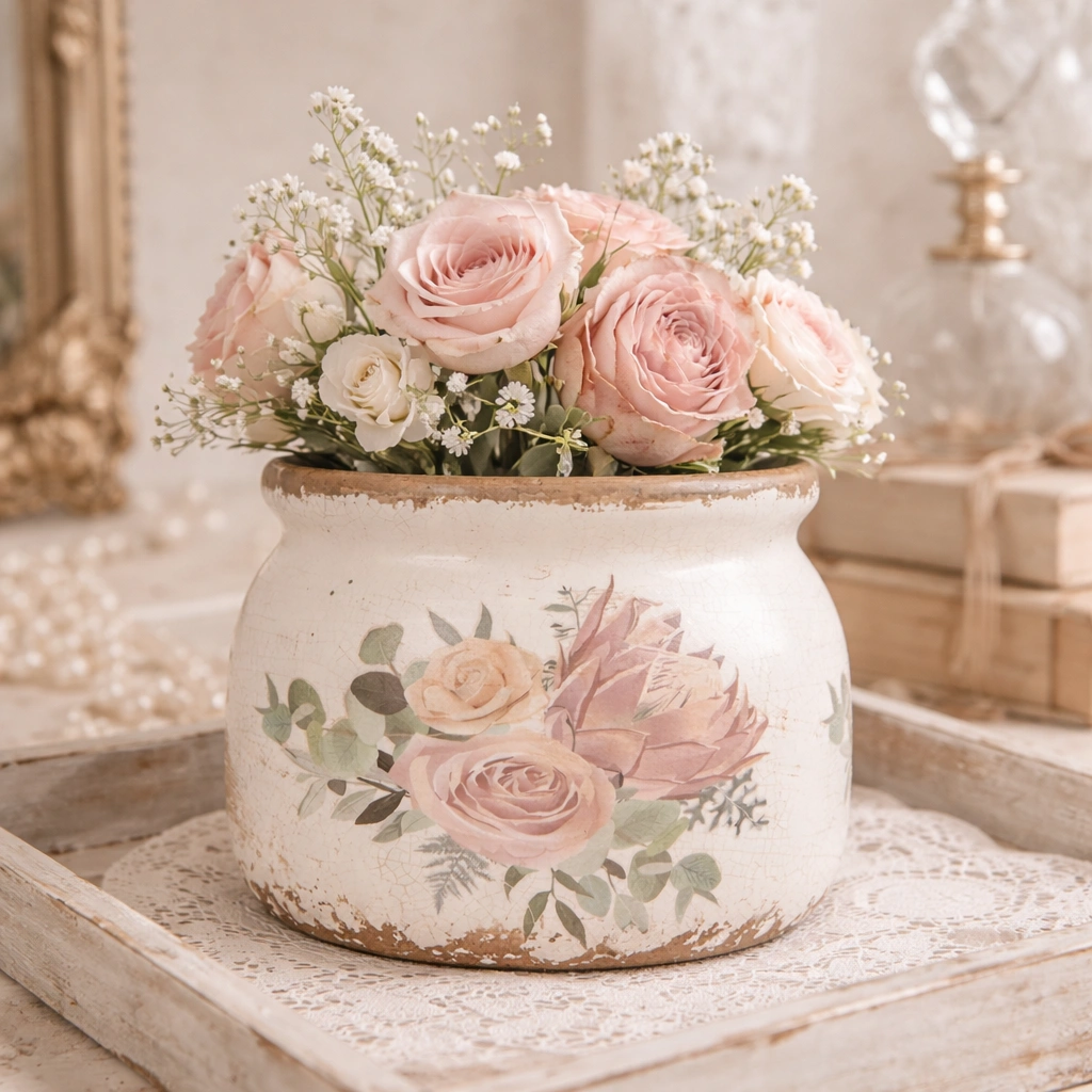 Delicato e romantico, questo vaso decorativo in stile shabby chic è perfetto per donare un tocco provenzale e raffinato ai tuoi ambienti. Realizzato con finitura effetto craquelé e bordi volutamente anticati, presenta una splendida decorazione floreale con rose dai toni cipria e foglie verde salvia, per un risultato elegante e senza tempo.