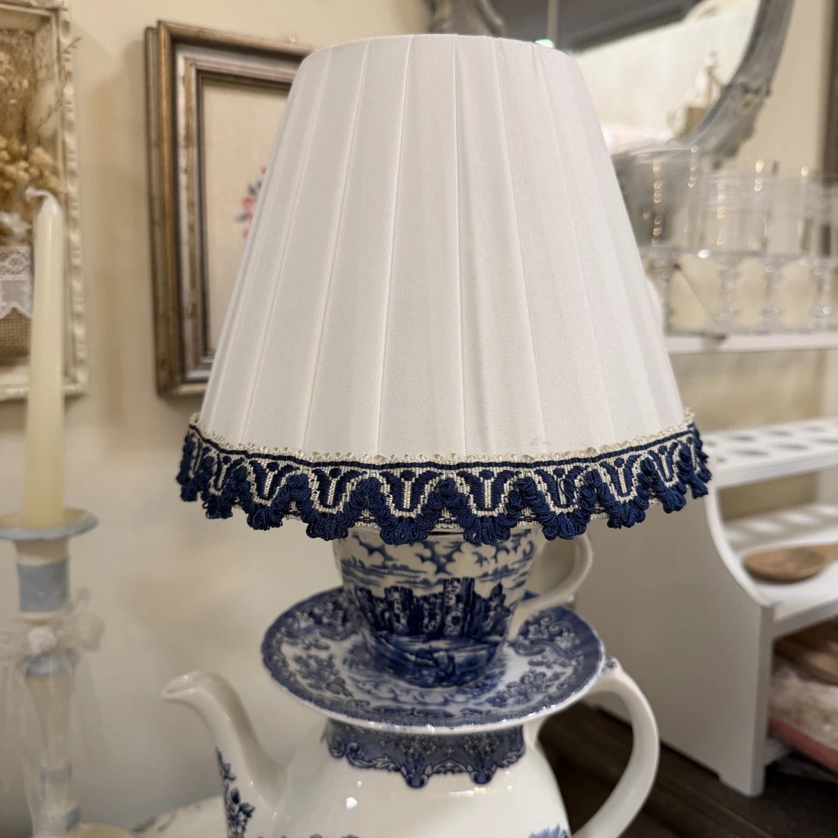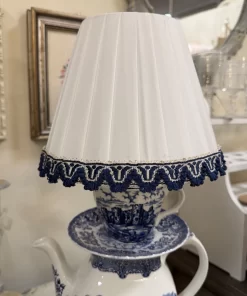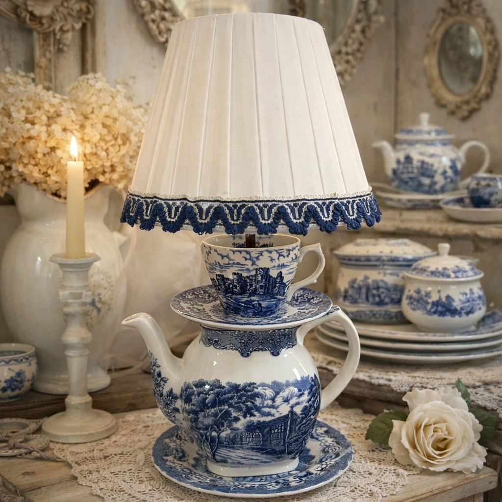 Il paralume plissettato color panna, rifinito con un elegante bordo blu, riprende perfettamente le tonalità delle ceramiche, donando un’atmosfera calda, romantica e senza tempo.