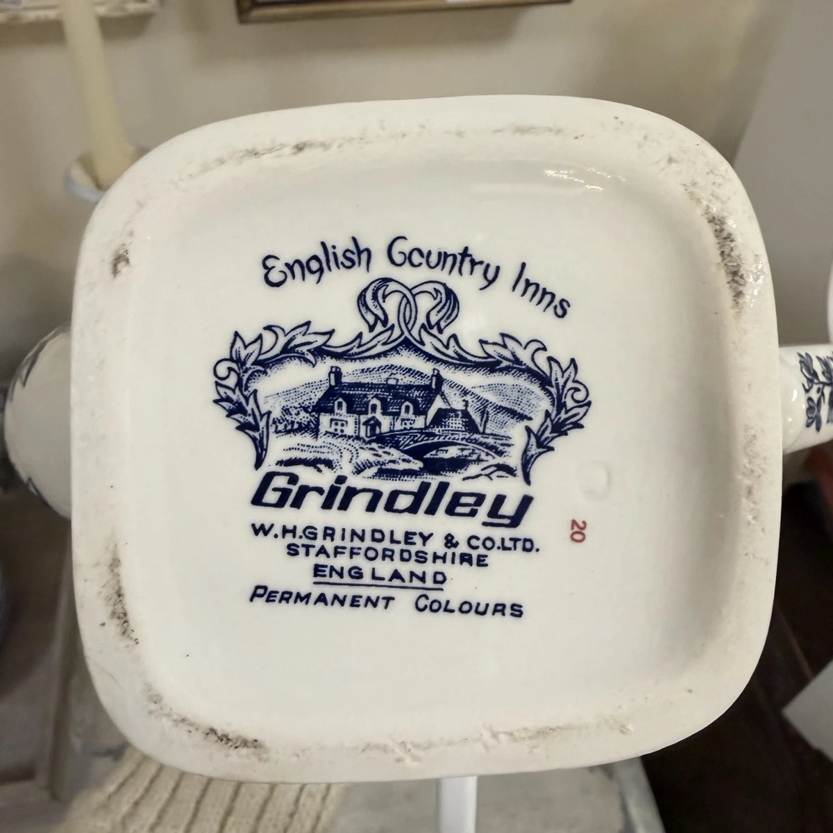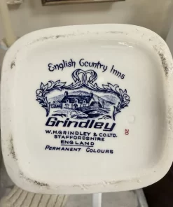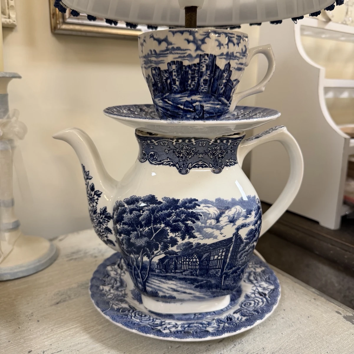 La base è composta da una teiera della linea “English Country Inns”, caratterizzata da raffinati paesaggi bucolici in blu su fondo avorio, tipici della produzione Staffordshire. Il tutto è arricchito da piattini e tazza coordinati, creando una composizione armoniosa e ricca di carattere.