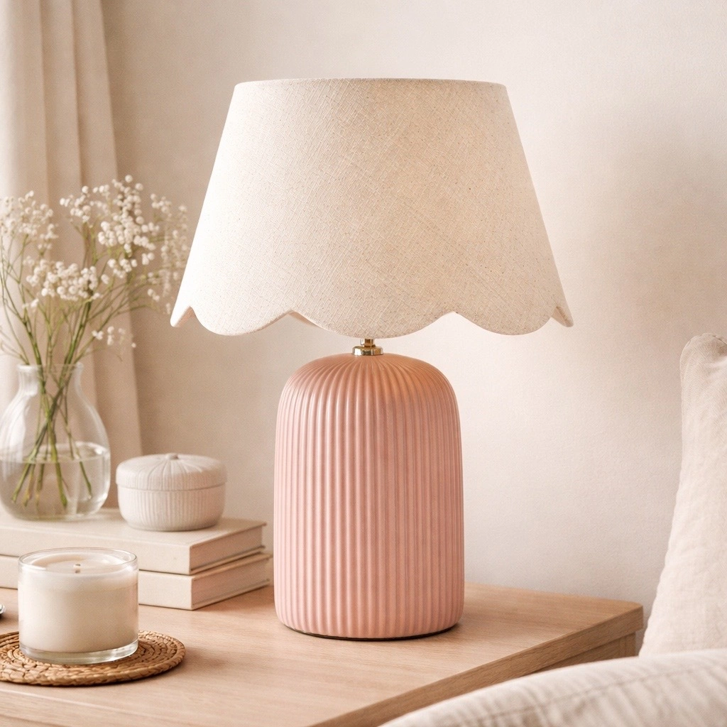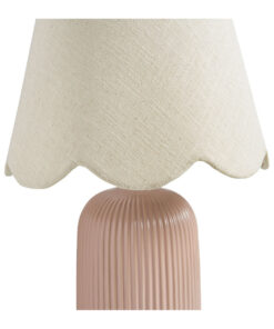 Elegante e delicata, questa lampada da tavolo è il complemento perfetto per creare un’atmosfera calda e accogliente in ogni ambiente della casa. La base in ceramica rosa cipria, con lavorazione a rilievo verticale, dona carattere e raffinatezza, mentre il paralume in tessuto color naturale con bordo ondulato aggiunge un tocco romantico e provenzale.