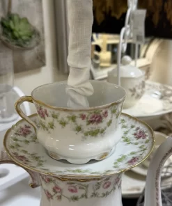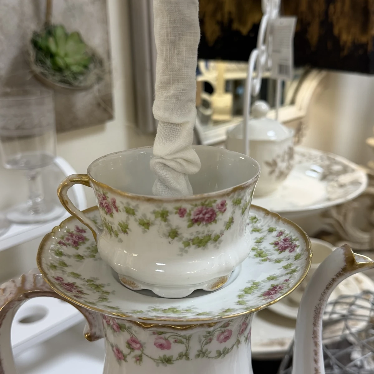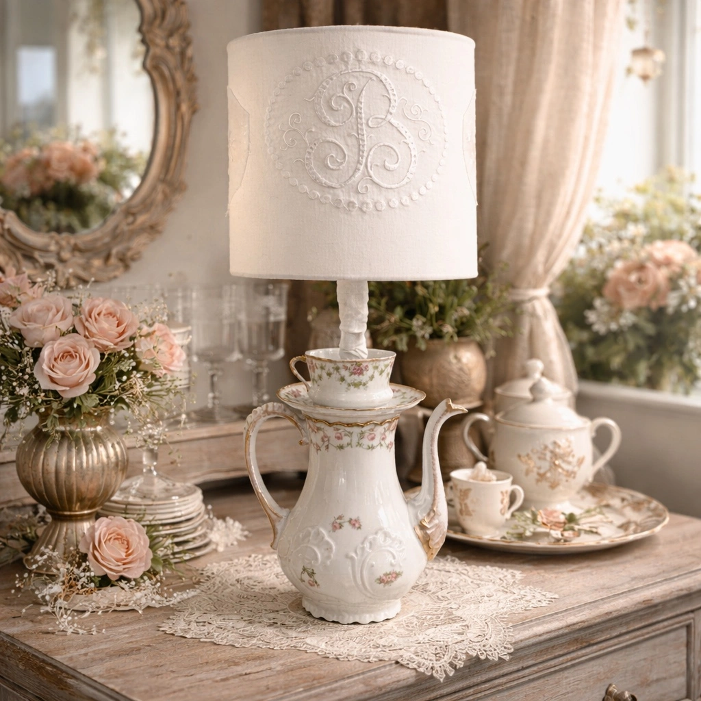 La base è composta da una delicata teiera decorata con romantici motivi floreali dai toni rosa e dettagli dorati, impreziosita da una tazzina coordinata che crea un insieme armonioso e ricercato. Il paralume in lino, con raffinato ricamo in rilievo, completa l’estetica donando un tocco caldo e accogliente.