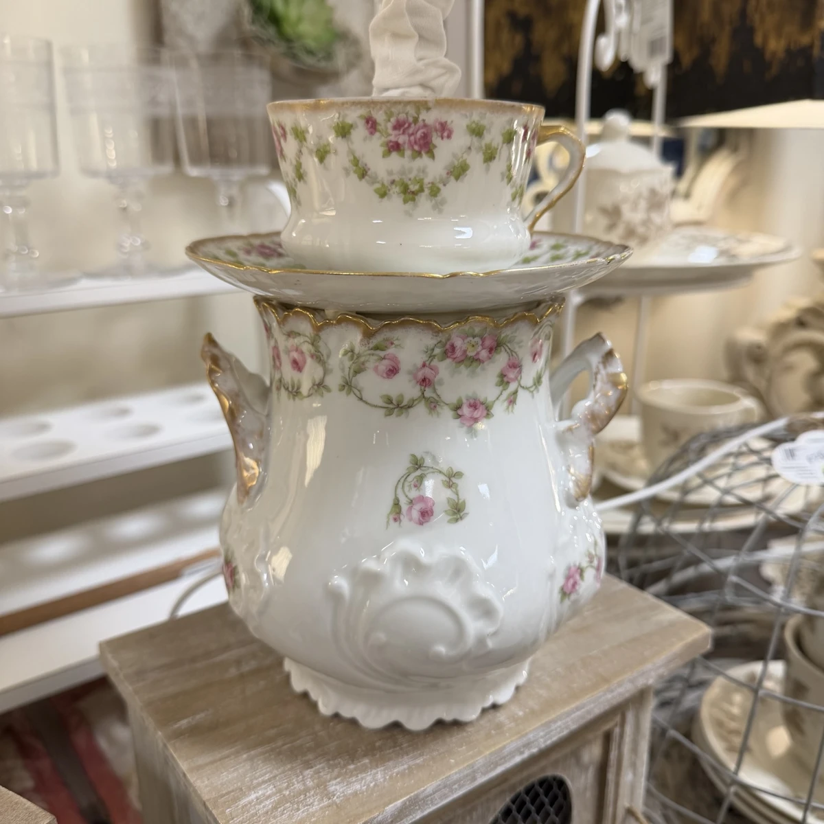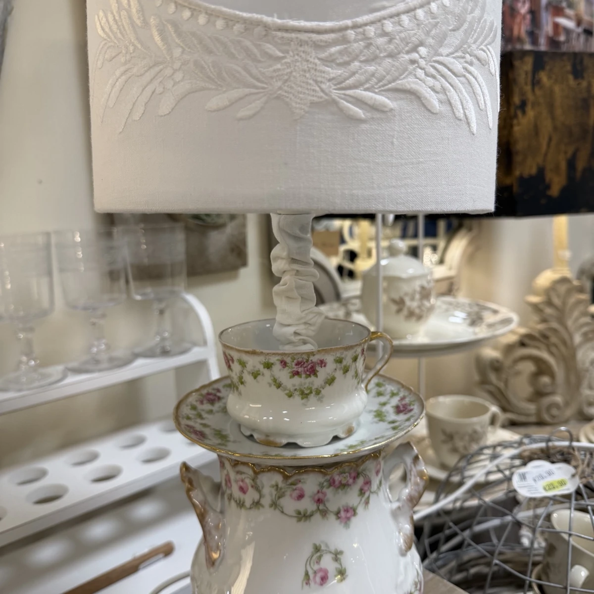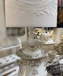 La base è composta da una splendida zuccheriera in porcellana Limoges, impreziosita da delicati motivi floreali nei toni del rosa e dettagli dorati, affiancata da tazzina e piattino coordinati. Il tutto è armoniosamente assemblato per creare una lampada dal forte impatto estetico e dal fascino romantico senza tempo.
