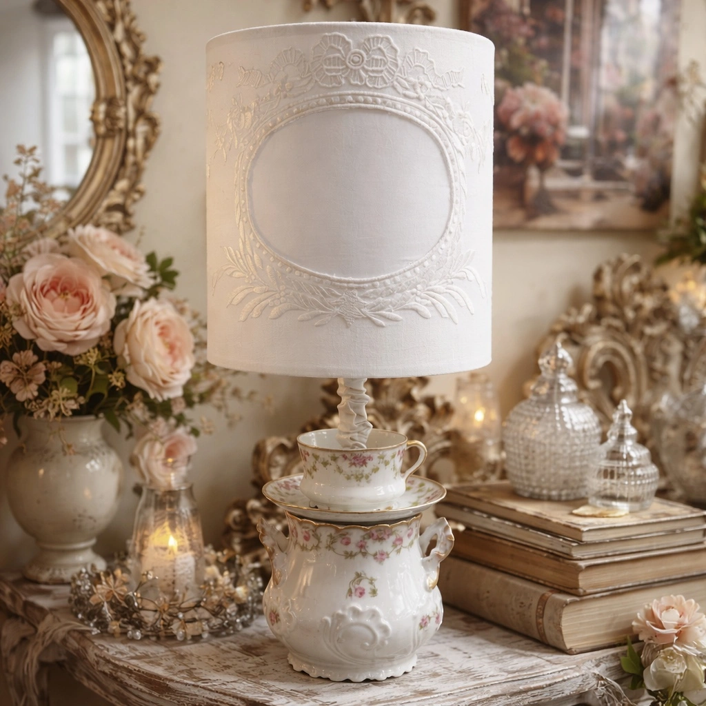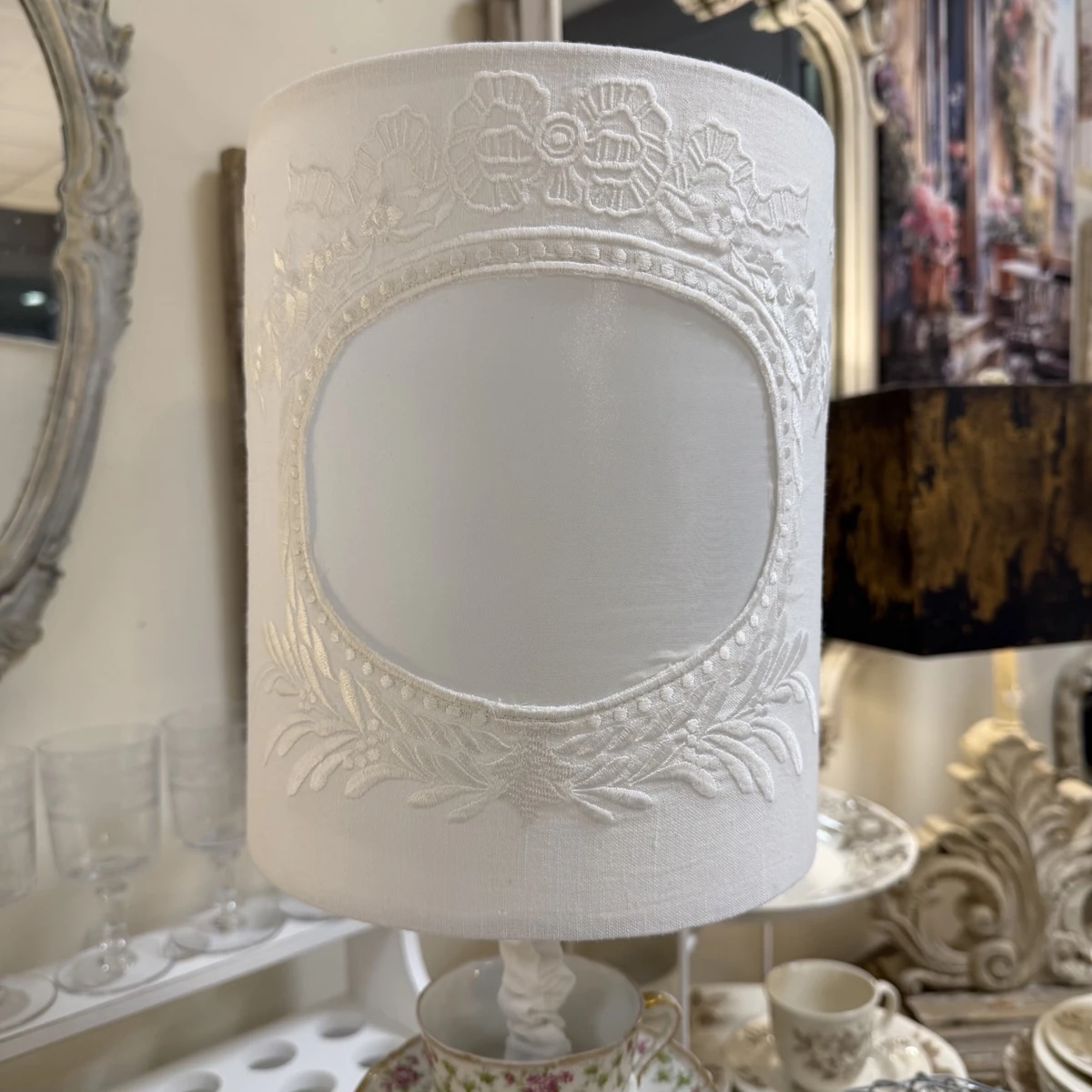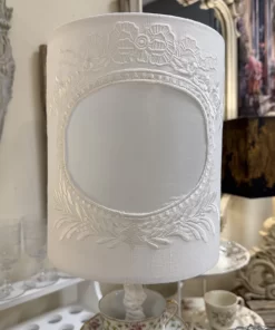 Il paralume in lino chiaro, decorato con eleganti ricami in rilievo, diffonde una luce calda e soffusa, perfetta per creare un’atmosfera accogliente e sofisticata.