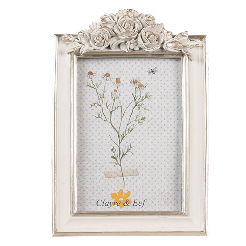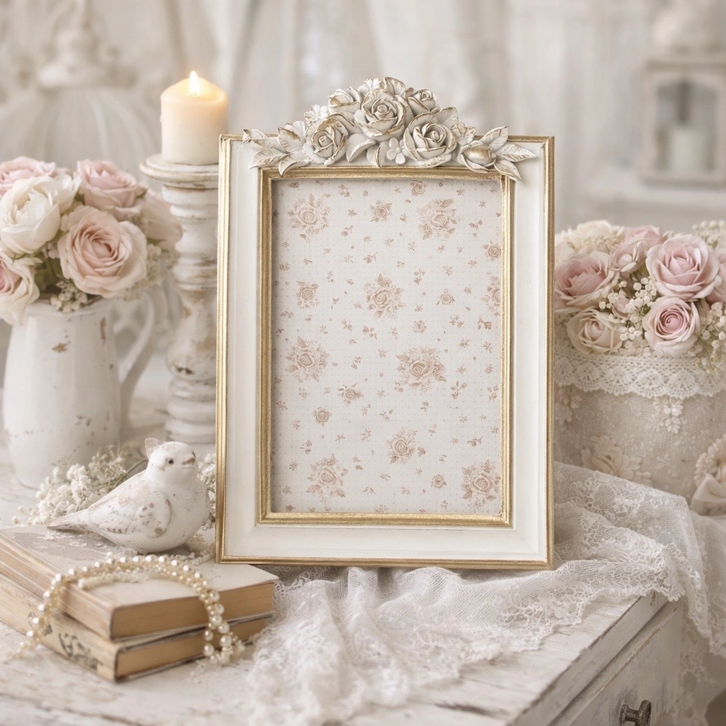 Elegante e romantico portafoto in resina, perfetto per donare un tocco raffinato e senza tempo ai tuoi ambienti. La cornice, in un delicato bianco anticato, è impreziosita da dettagli dorati e da un decoro superiore con rose in rilievo, che richiama tutto il fascino dello stile shabby chic provenzale.