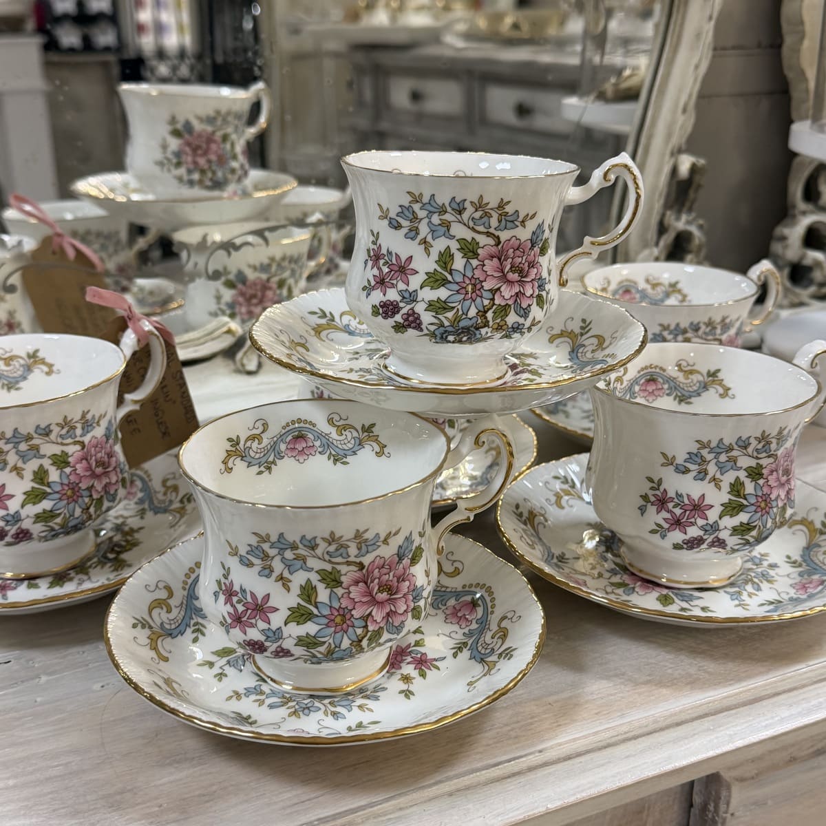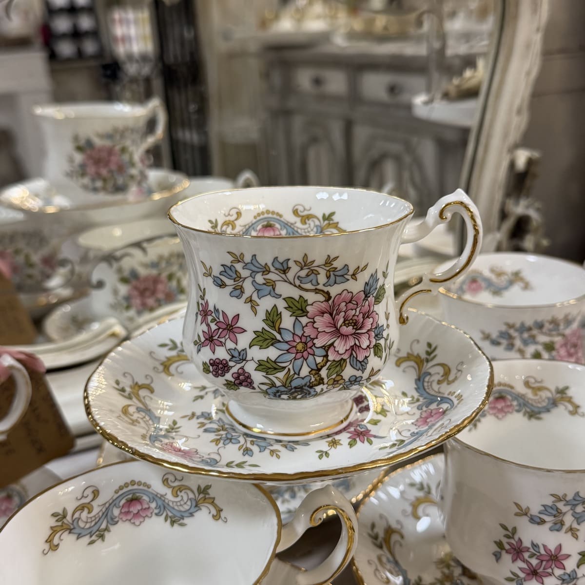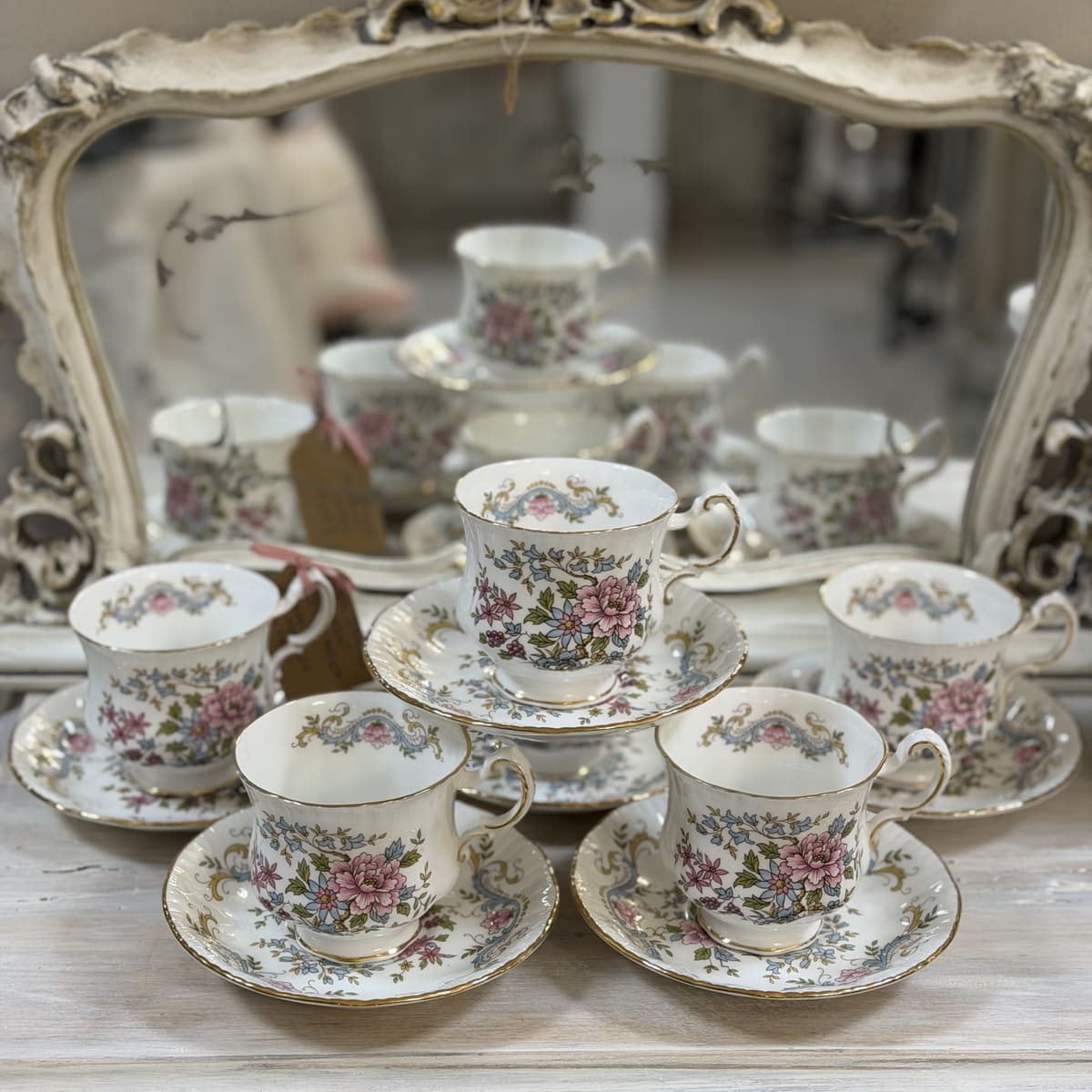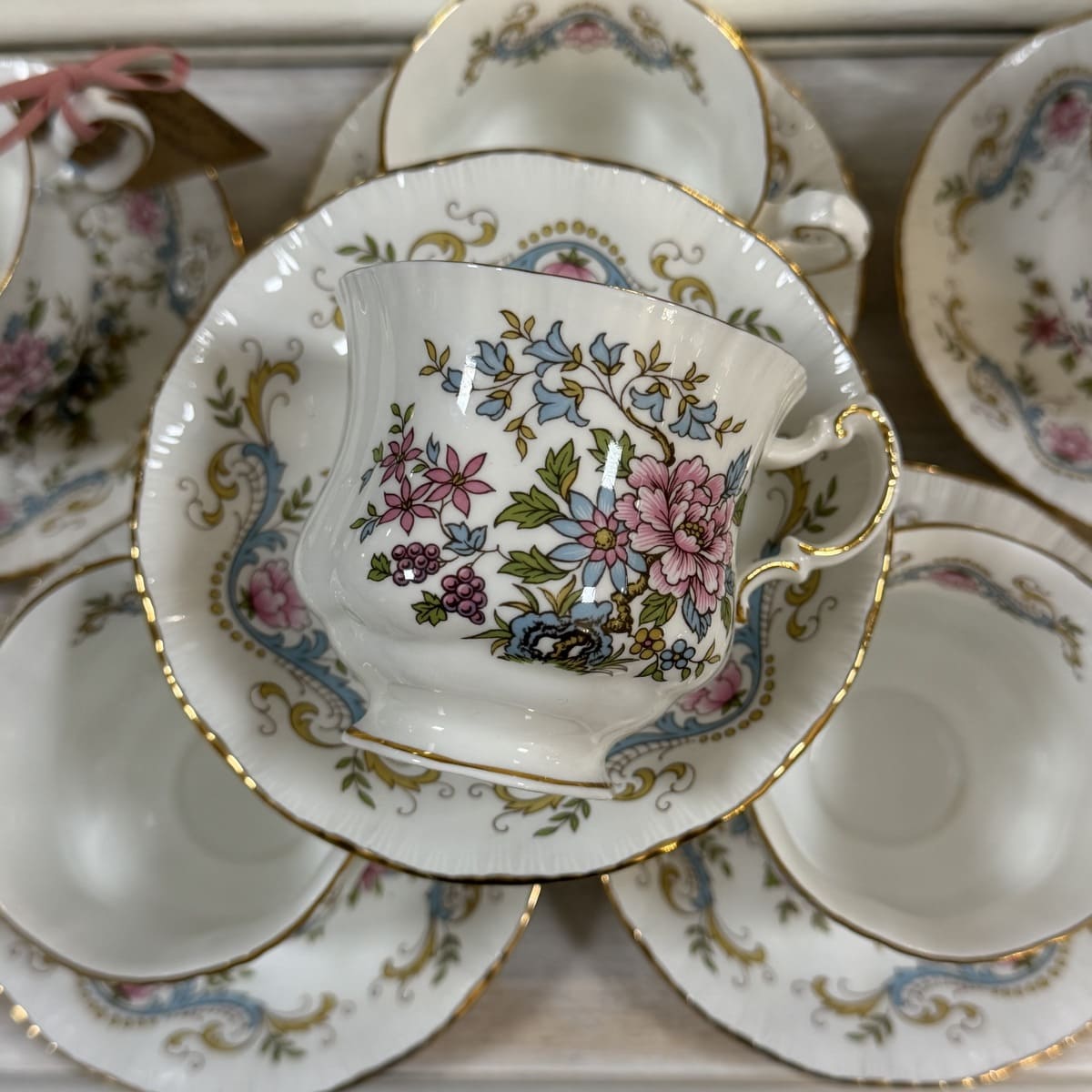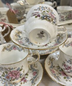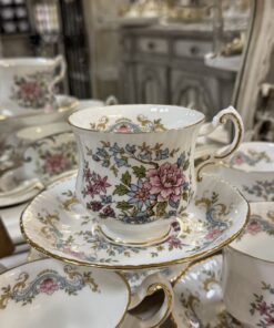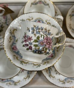 Il modello “Mandarin”, prodotto in Inghilterra negli anni ’50–’60, si distingue per il suo ricco decoro floreale policromo, con delicate sfumature di rosa, azzurro e verde, armoniosamente intrecciate a eleganti motivi ornamentali classici. Il tutto è impreziosito da raffinate filettature in oro, presenti sui bordi e sui manici sagomati, che donano al servizio un’eleganza romantica e senza tempo.