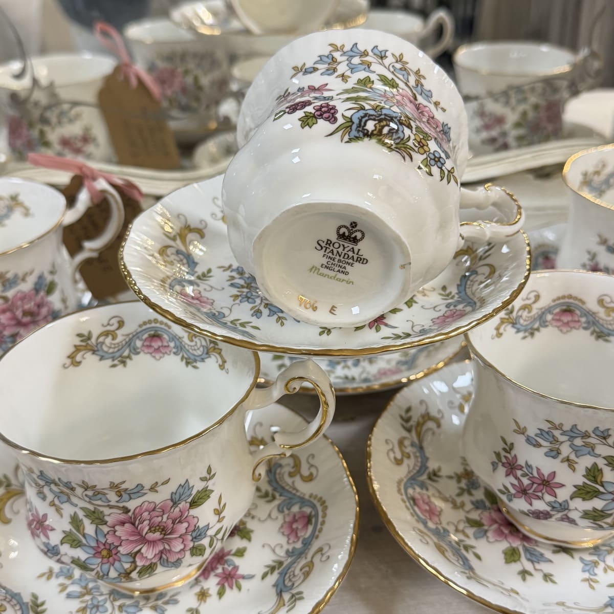 Raffinato servizio da tè vintage inglese Royal Standard, realizzato in preziosa fine bone china, celebre per la sua straordinaria leggerezza, luminosità e qualità senza tempo.