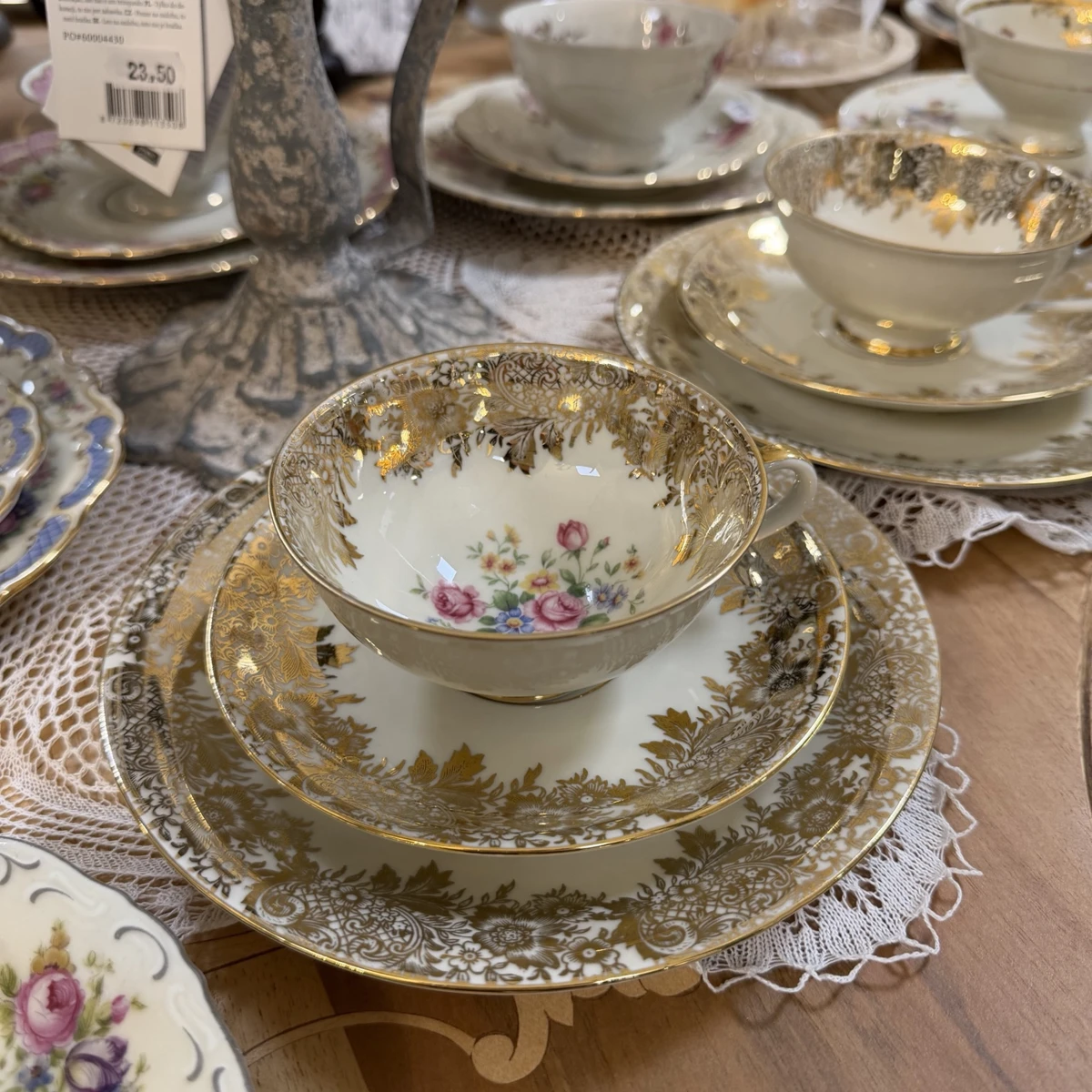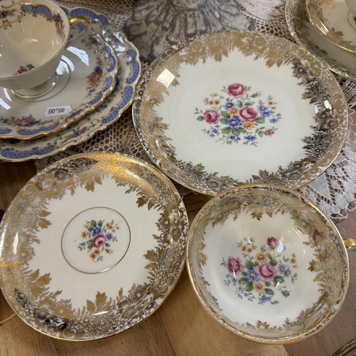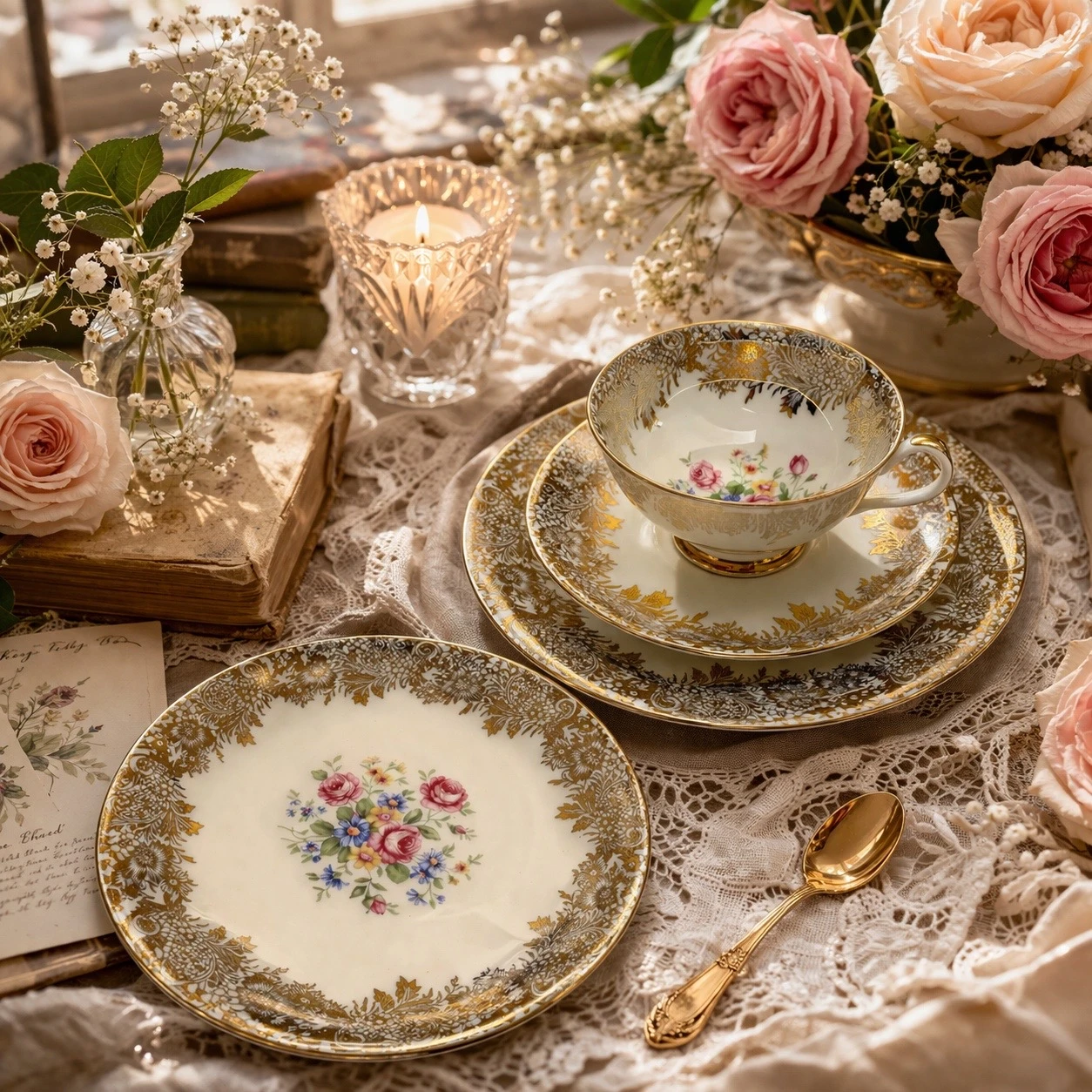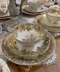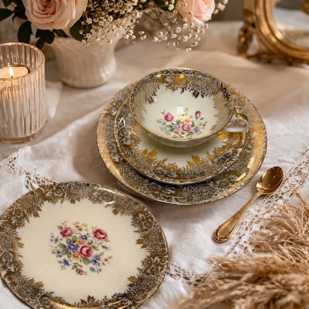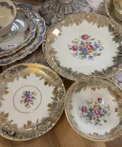 La porcellana, sottile e luminosa, è impreziosita da una ricca decorazione in oro zecchino con motivi floreali e dettagli finemente lavorati. Al centro, un romantico bouquet di rose e fiorellini dai toni pastello dona un tocco delicato e femminile, perfetto per ambienti shabby, provenzali o brocante.