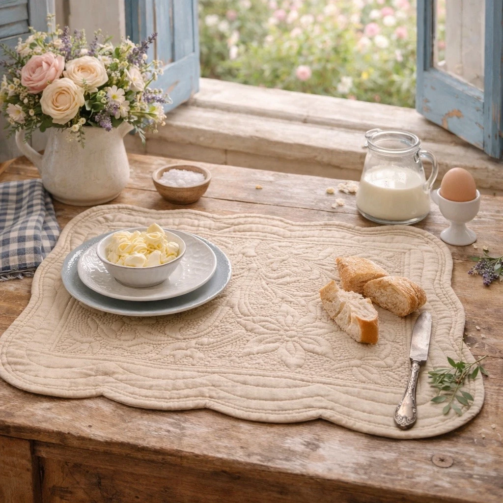 La forma sagomata con bordi morbidi e la lavorazione trapuntata artigianale richiamano il fascino delle case di campagna provenzali, donando alla tavola un’atmosfera calda, accogliente e romantica.