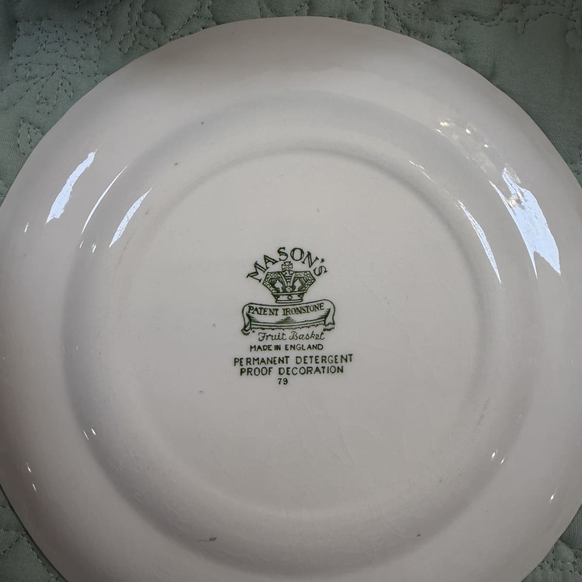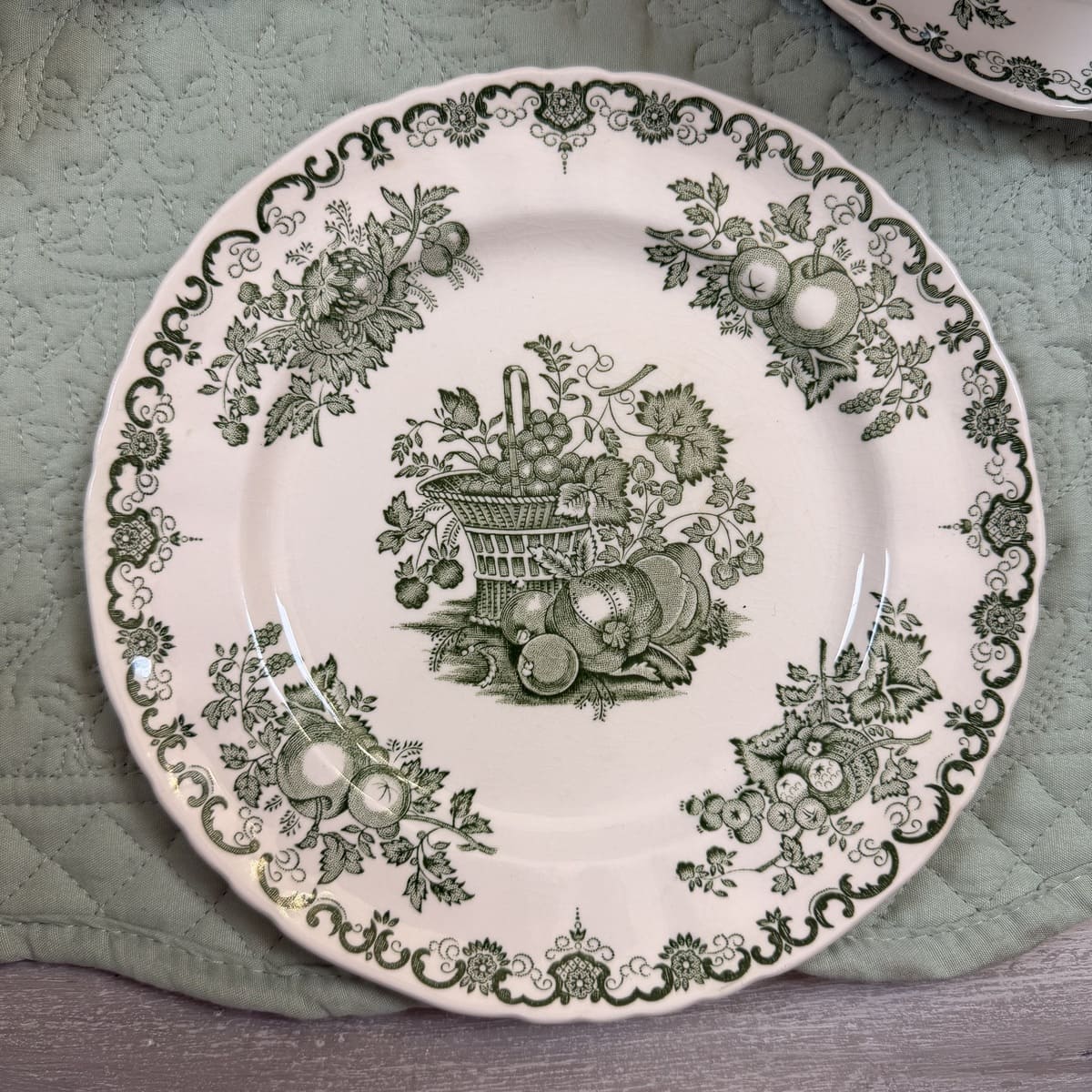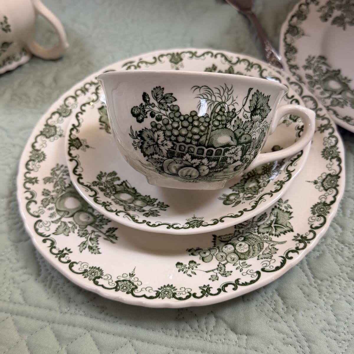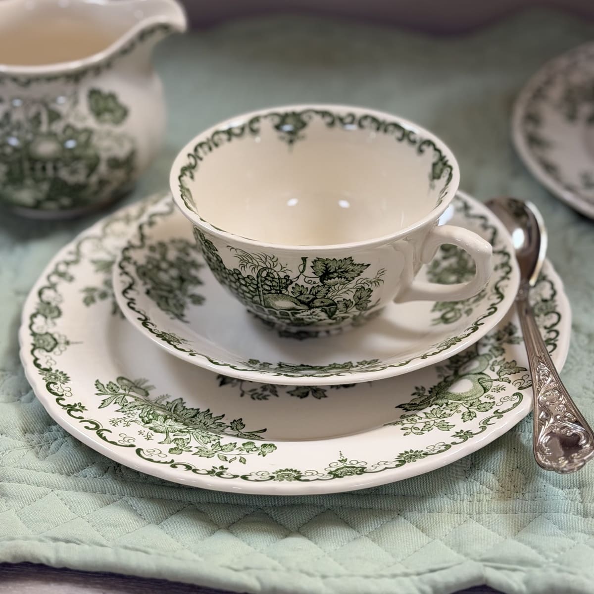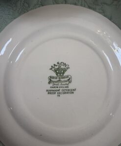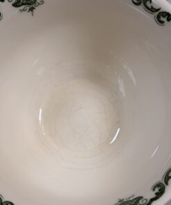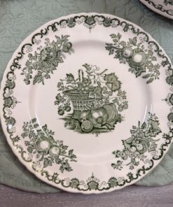 Raffinato trio da tè Mason’s composto da tazza, piattino e piatto dessert coordinato, in ceramica inglese con tipico decoro verde su fondo avorio. Il motivo ornamentale, ricco di dettagli in stile classico, richiama l’eleganza delle tavole inglesi di campagna e le atmosfere vittoriane.